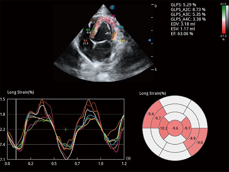 通过心肌识别技术与二维斑点追踪技术相结合,对心脏的超声图像进行量化分析。计算心肌17个节段的应变、应变率、速度、位移等,并通过牛眼图的形式进行呈现。